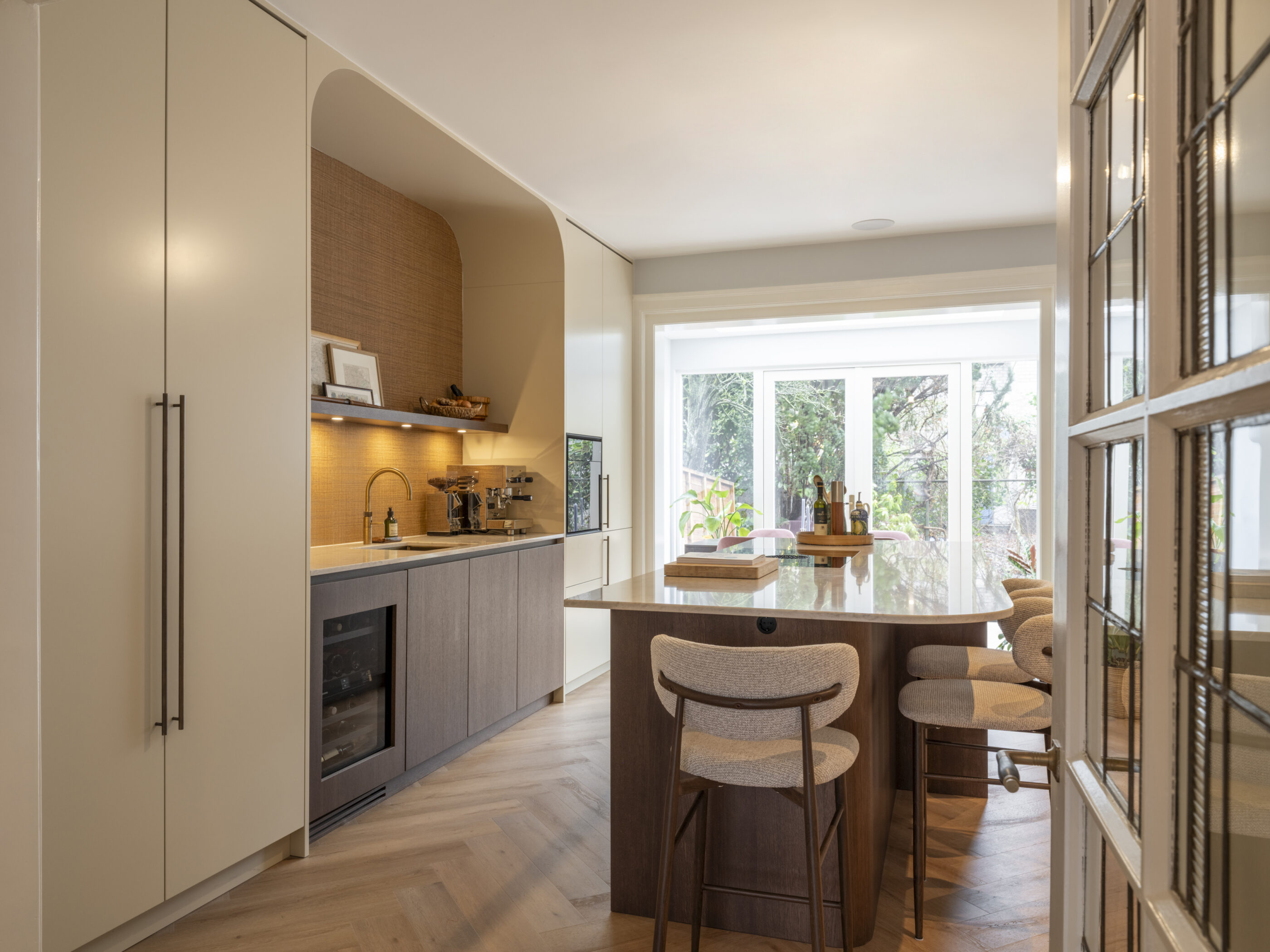 Deze exclusieve maatwerk keuken is ontworpen als een serene leefruimte waarin design en comfort naadloos samenkomen. De plafondhoge kastenwand vormt een rustig doordacht vormgegeven geheel, met een verfijnde nis als middelpunt. Het maatwerk kookeiland nodigt uit tot koken en samenzijn, terwijl zachte rondingen en warme materialen zorgen voor een tijdloze uitstraling. Het Taj Mahal composiet werkblad versterkt het luxe karakter en maakt dit ontwerp tot een keuken waarin beleving centraal staat.